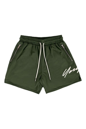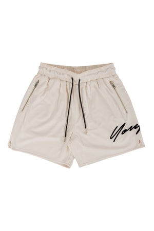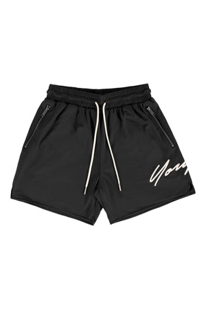DESIGN: One-of-a-kind signature lifestyle basketball shorts. Made with one layer soft mesh fabric, elastic waistband with contrast color drawcords, metal zippers for a nice accent, and signed by YoungLA flock logo on the side.