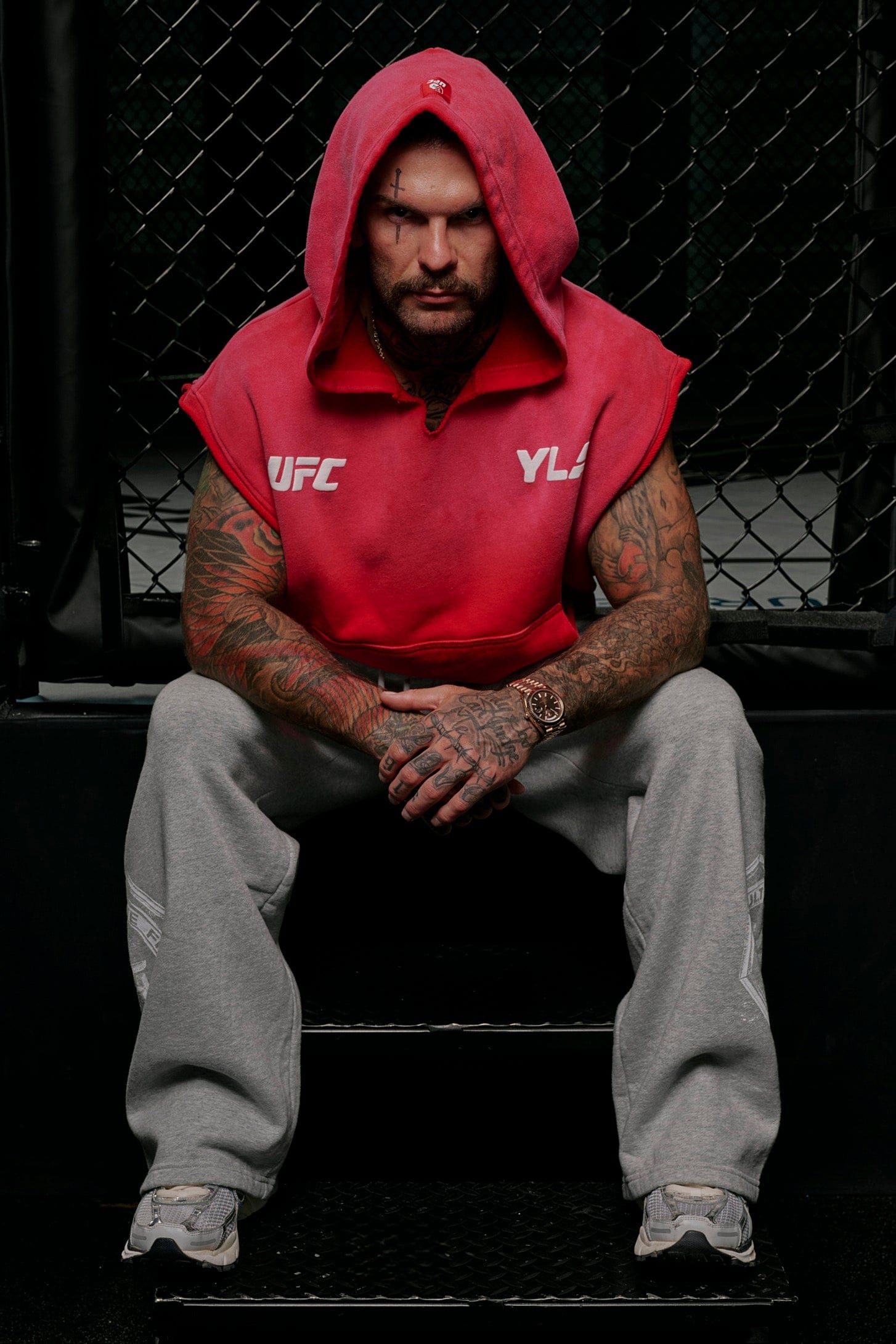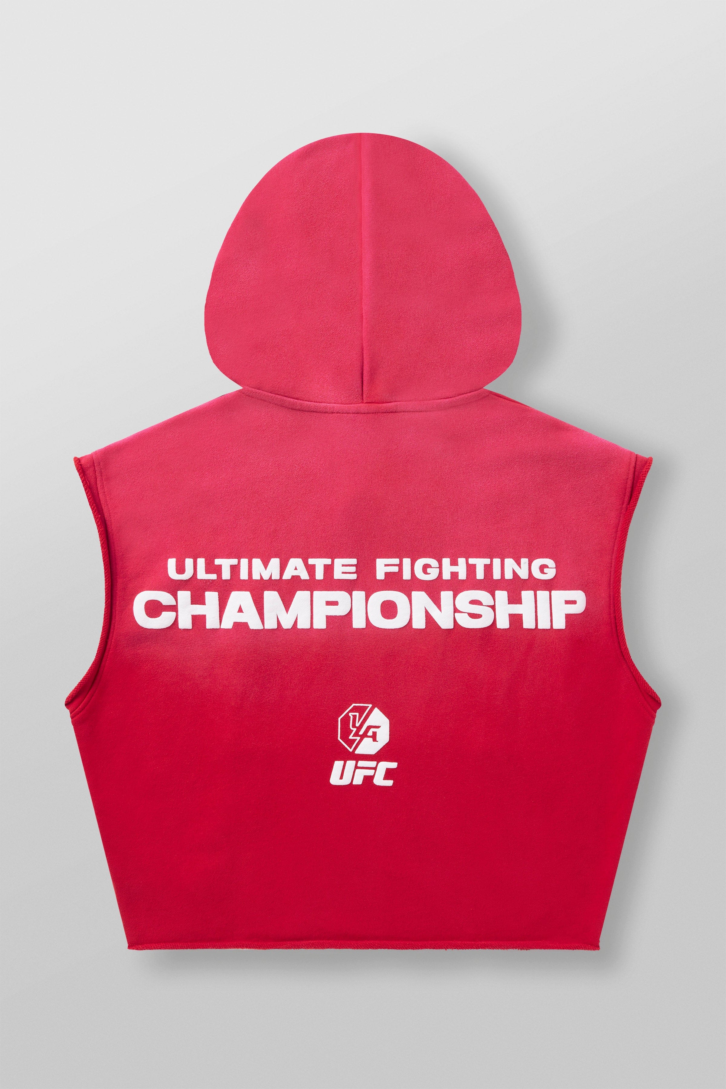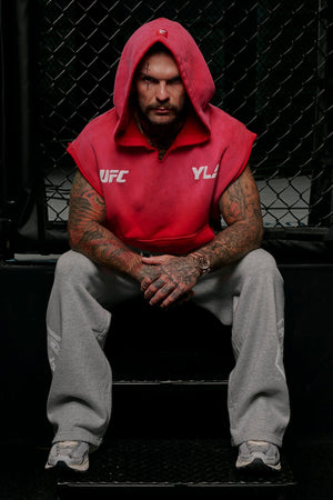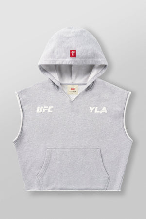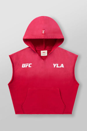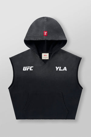 DESIGN: Introducing the YoungLA x UFC cut-off hoodie, made from 100% cotton for a soft and relaxed fit. This sleeveless hoodie features puff print logos on the chest and is garment-washed for a cool vintage look. Whether you're working out or relaxing, this hoodie combines style and comfort, perfect for any UFC fan looking for an effortless athletic vibe.