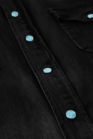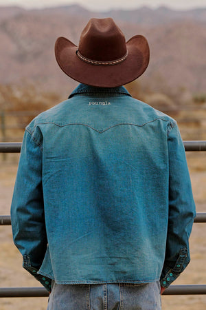 DESIGN: Inspired by classic rodeo style, the Western Denim Shirt brings a modern edge to a timeless Western silhouette. Featuring a structured yoke, pointed chest pockets, and a distinctive Western cut, this shirt embodies rugged sophistication. The washed denim delivers a sleek, worn-in look, while the turquoise blue stone buttons add a bold pop of color.