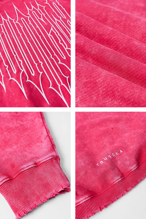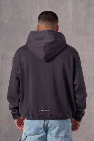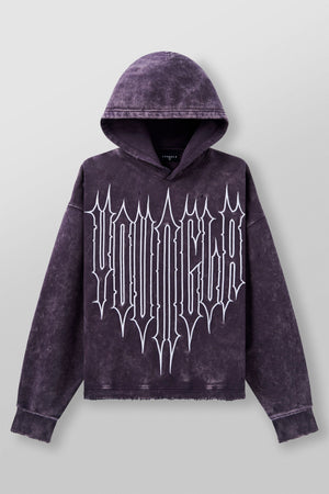 DESIGN: The Revenge Pullover Hoodie. Made from premium acid-washed cotton, this hoodie features an embroidered outline of the Revenge logo on the front, adding a striking detail to the classic pullover. Distressed cuts on the cuffs and waistband, paired with a short waistband height, give it a rugged, modern look.