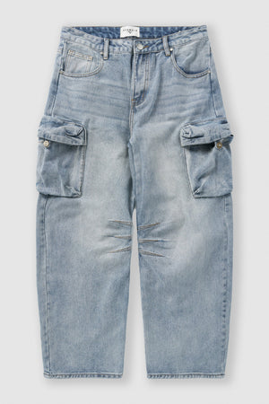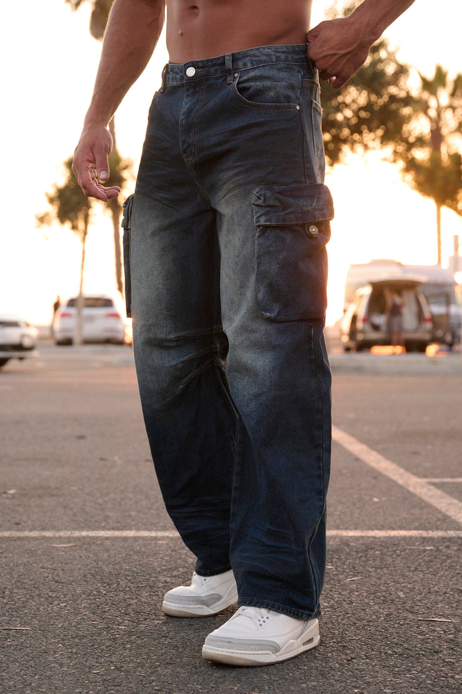 DESIGN: These cargo baggy jeans bring a modern twist to classic denim. Designed with a loose fit and large cargo pockets, they offer both style and practicality. The wash and subtle fading add a lived-in, vintage feel, making these jeans a go-to for effortless street style.