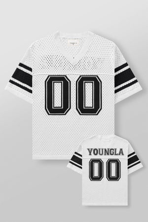 DESIGN: The Varsity Knit Jersey brings a bold athletic look with a premium touch. Crafted from breathable cotton with mesh-style knit holes, this jersey combines retro sports vibes with elevated comfort. Featuring classic stripes, varsity numbers, and a true-to-size fit, it's built to stand out.