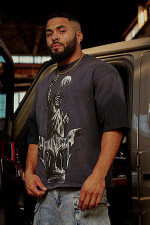 DESIGN: The Liberty Tees combine bold design with premium comfort. Crafted from 100% cotton with a sturdy 290 GSM weight, this shirt features a boxy fit and short length for a relaxed, modern silhouette. A striking graphic dominates the front, making this tee a standout piece in any wardrobe.