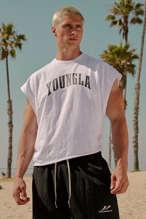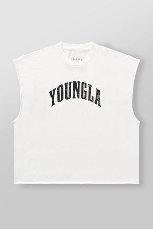 DESIGN: The Huge Cut Offs are built for max comfort and presence. Made from soft 250 GSM cotton, this oversized sleeveless tee delivers a relaxed drape with vintage-wash character. Featuring a bold YoungLA logo printed across the chest, it’s your go-to for heavyweight lifts or laid-back style.