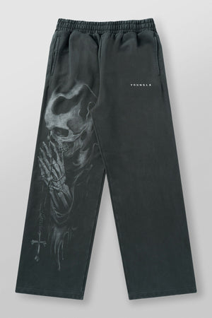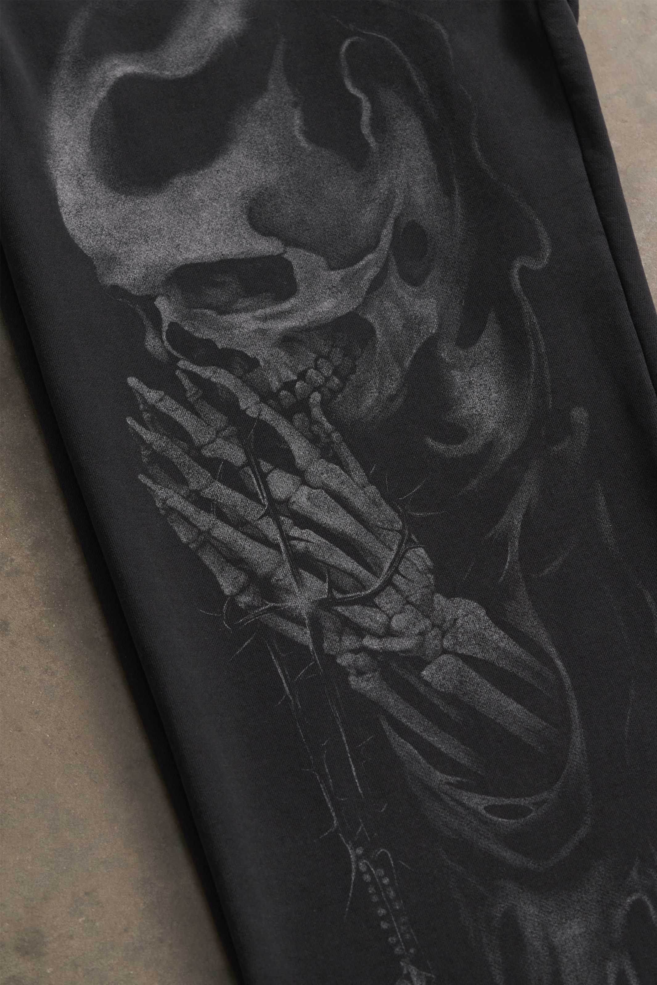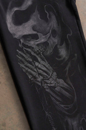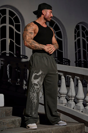 DESIGN:  Designed with a baggy fit, these sweatpants are crafted from premium 100% cotton, boasting an ultra-heavyweight 460 GSM for durability and a luxurious feel. Featuring a striking printed skull graphic on the left leg, the design seamlessly integrates into the fabric, giving it a natural and elevated aesthetic.