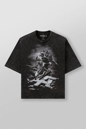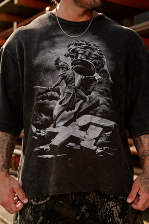 DESIGN: The Gladiator Tee delivers heavy-hitting energy with a bold front graphic of a warrior clashing with a lion atop a cracked YLA stone logo. Made 400 GSM cotton, it features an oversized fit and a vintage-washed finish for that worn-in, battle-ready look. Built for those who move with power and presence.