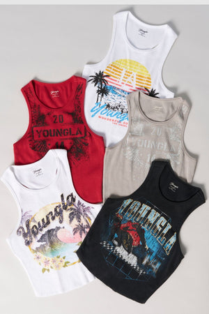 DESIGN: Introducing our Vintage Washed Tank: a versatile and stylish piece that comes in five unique graphic prints. Perfectly combining retro vibes with modern streetwear, this tank is a standout addition to any wardrobe. Pair it with our Carry All Cargo Jeans for an effortless streetwear look that's both trendy and comfortable.